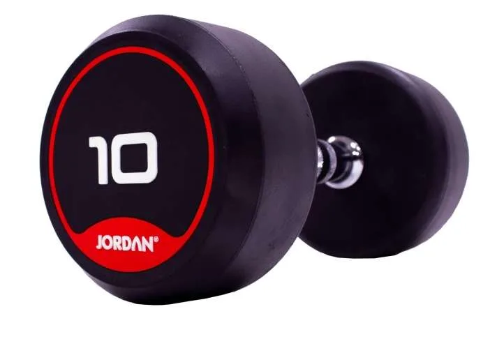 The 10kg Jordan Rubber Dumbbells have a classic round design with metal handle and rubber coated weight ends. The rubber ensures that they dumbbells do not damage your hard wood flooring.