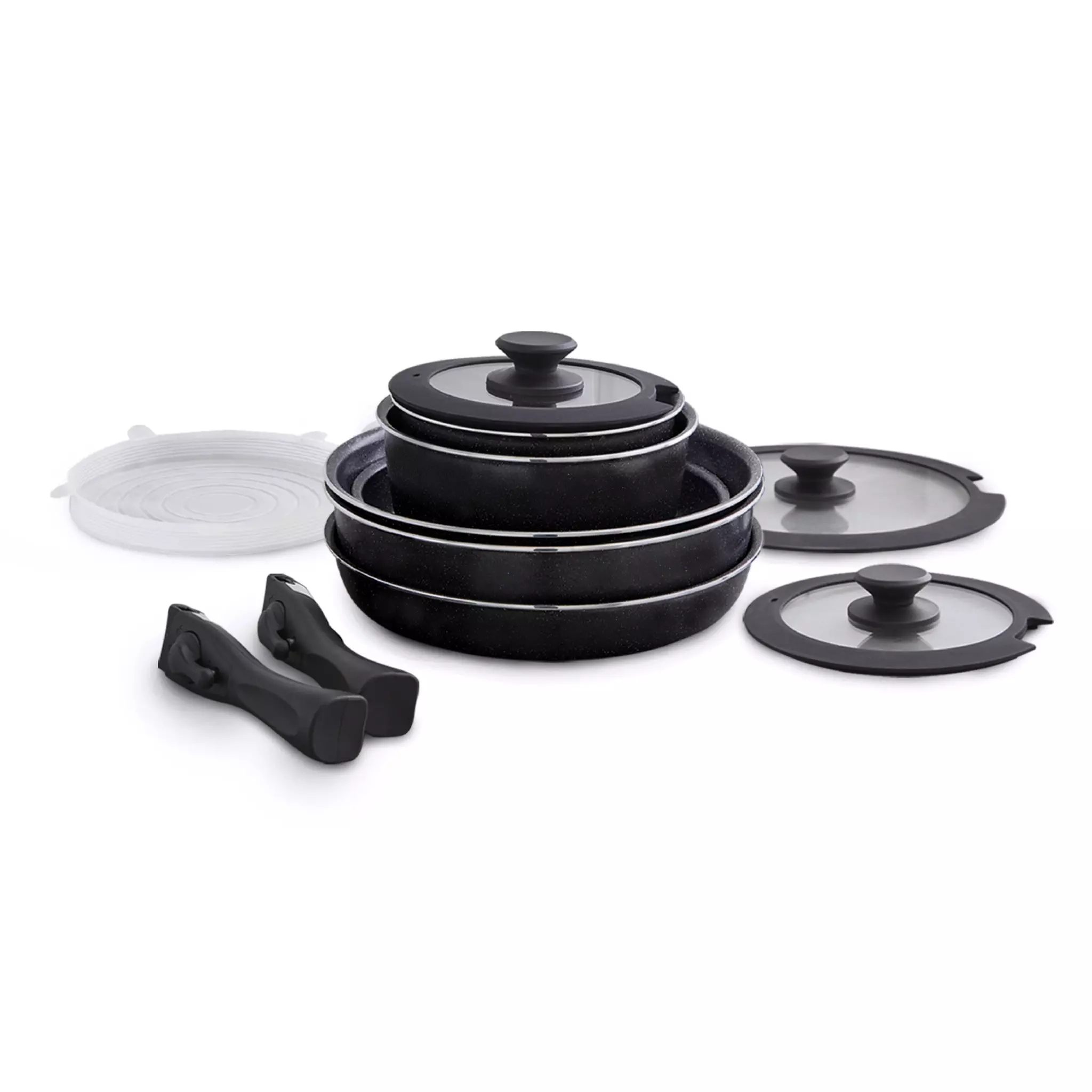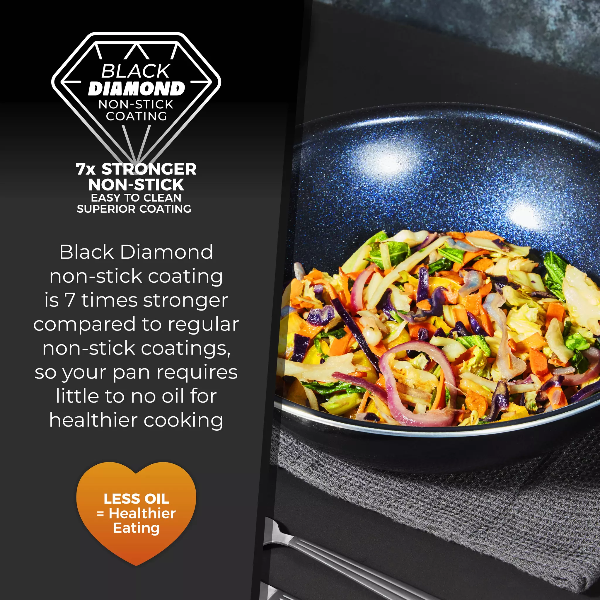 This set includes everything you need to prepare delicious meals for your family and friends, from frying pans and saucepans to a casserole dish and a wok. All the pieces are made of high-quality aluminium with a black diamond coating that is 10 times stronger than standard non-stick coatings.