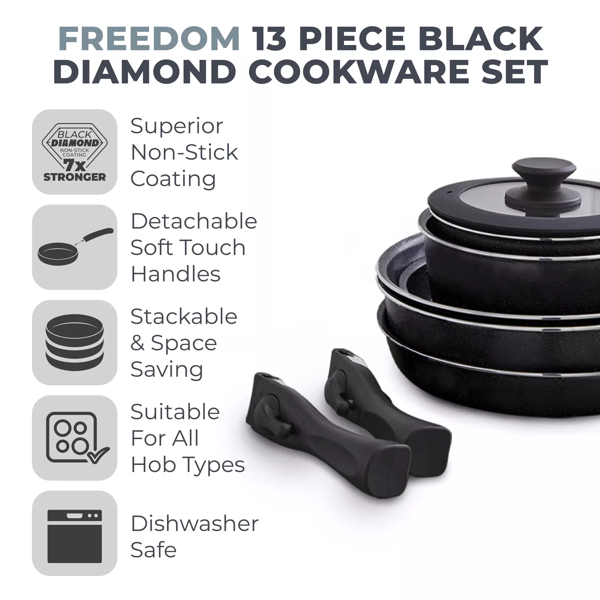 Don’t miss this opportunity to upgrade your kitchen with the 13 Piece Freedom Cookware Set with Black Diamond Coating!