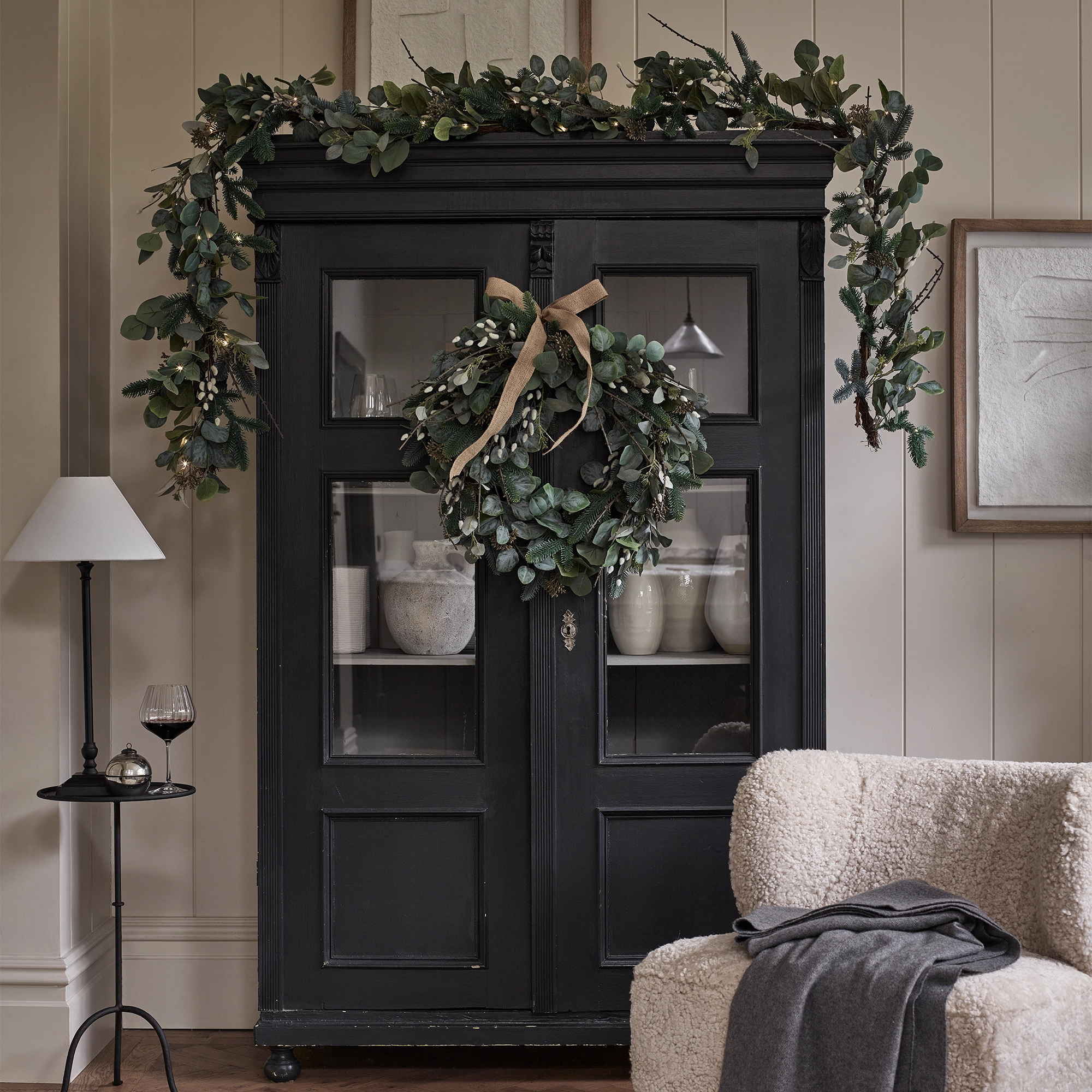 – Foliage: Lush, high-quality faux greenery, including pussywillow and fir branches.