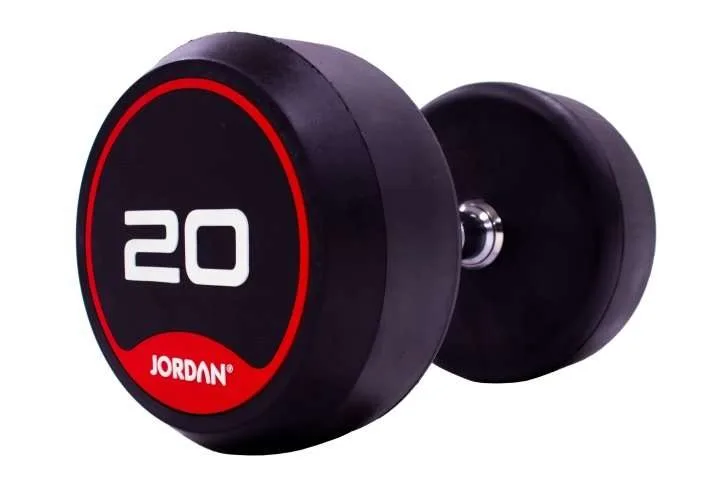 The 32.5kg Jordan Rubber Dumbbells have a classic round design with metal handle and rubber coated weight ends. The rubber ensures that they dumbbells do not damage your hard wood flooring.