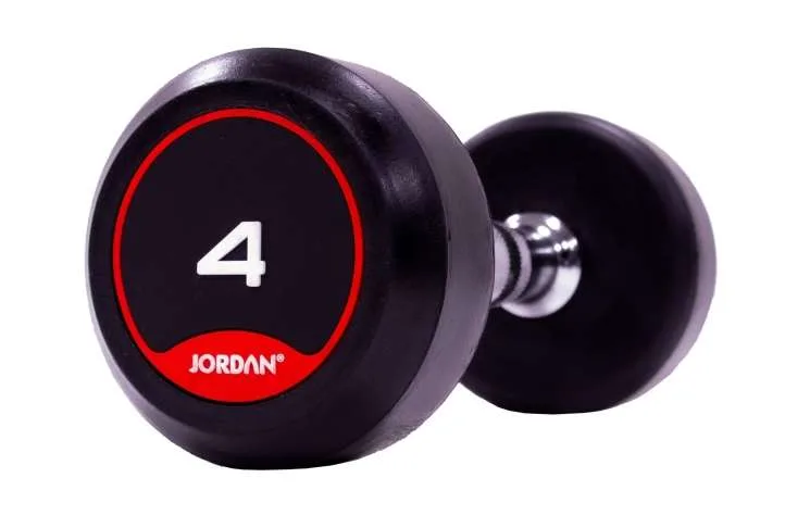 The 4kg Jordan Rubber Dumbbells have a classic round design with metal handle and rubber coated weight ends. The rubber ensures that they dumbbells do not damage your hard wood flooring.