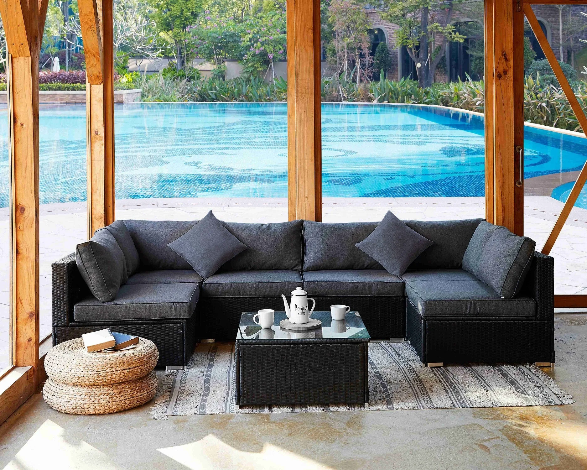 7 Piece Modular Rattan Sofa Garden Lounge Set , Black