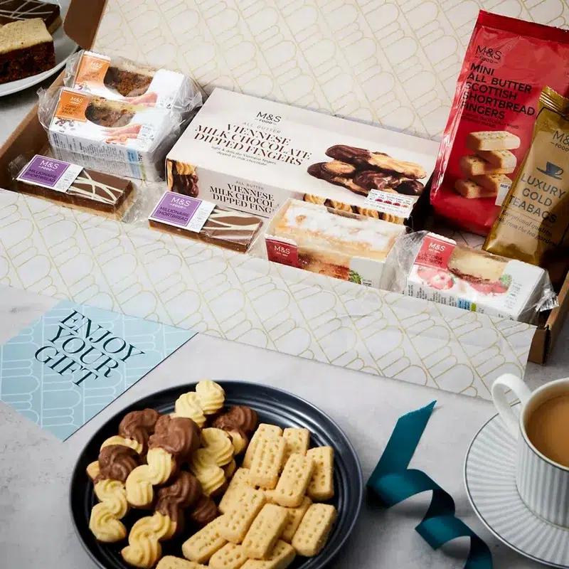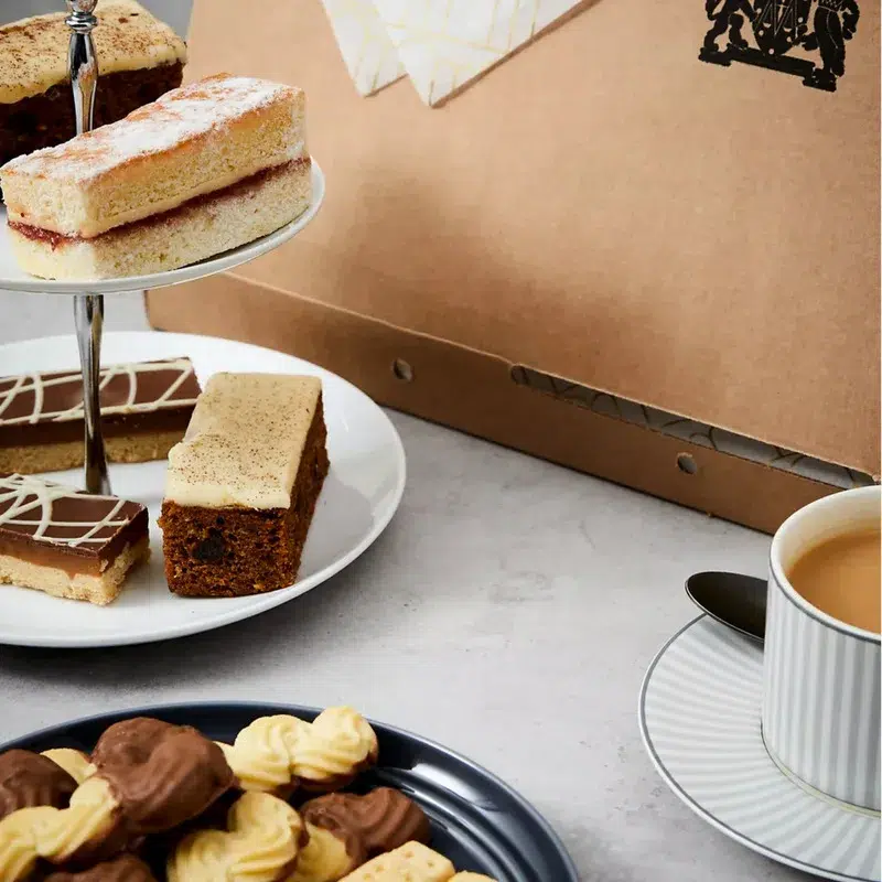Leave the guess work behind. This beautiful letterbox coronation afternoon tea set has everything you need to host or give the perfect afternoon tea session. The charming box will fit in your letter box and contains delicious treats including a Victoria sandwich, carrot cake, millionaire shortbread bars and delicious biscuits. Enjoy all the treats with a lovely cup of our Luxury Gold Tea.