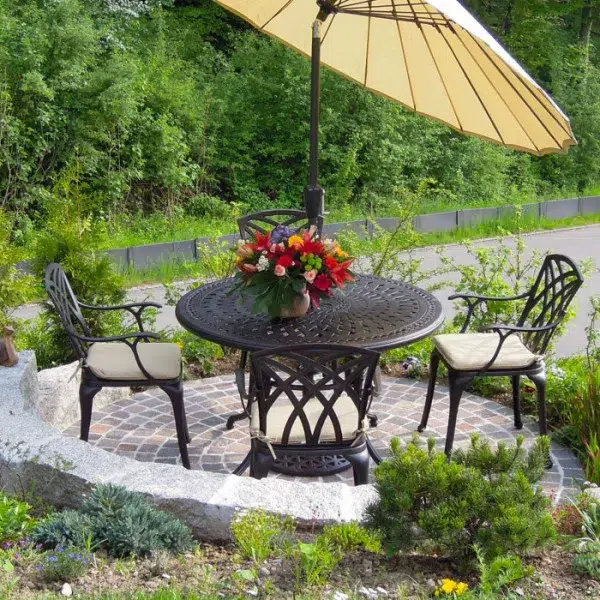 The set is made of high quality, durable materials that ensure it will withstand the elements and provide many years of enjoyment. The antique bronze finish adds a touch of vintage charm to the set, making it a perfect choice for those who appreciate classic design elements. Whether you’re hosting a small gathering or enjoying some quiet time outdoors, the Alice Table Antique Bronze 4 Seater Set is sure to impress.