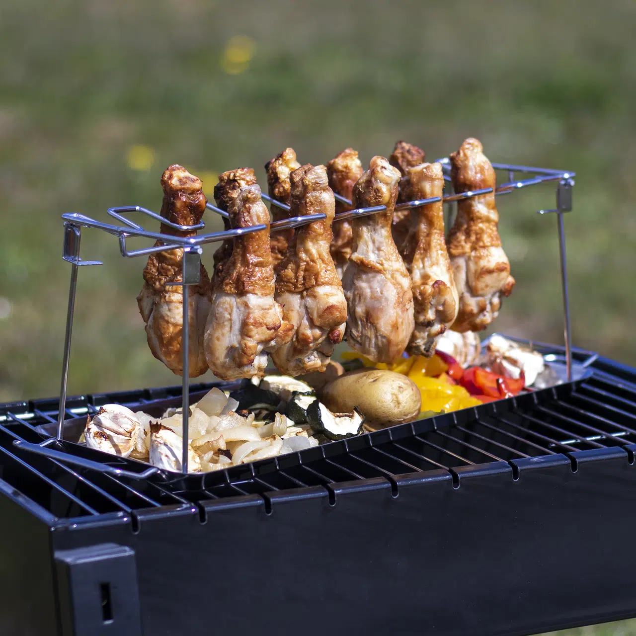 The rack can hold up to 14 drumsticks in the vertical position. Underneath the hanging meat is a tray that will catch any drips. You can place chopped up vegetables onto the tray so they absorb and cook in lovely chicken gravy that has been created by the cooking meat.