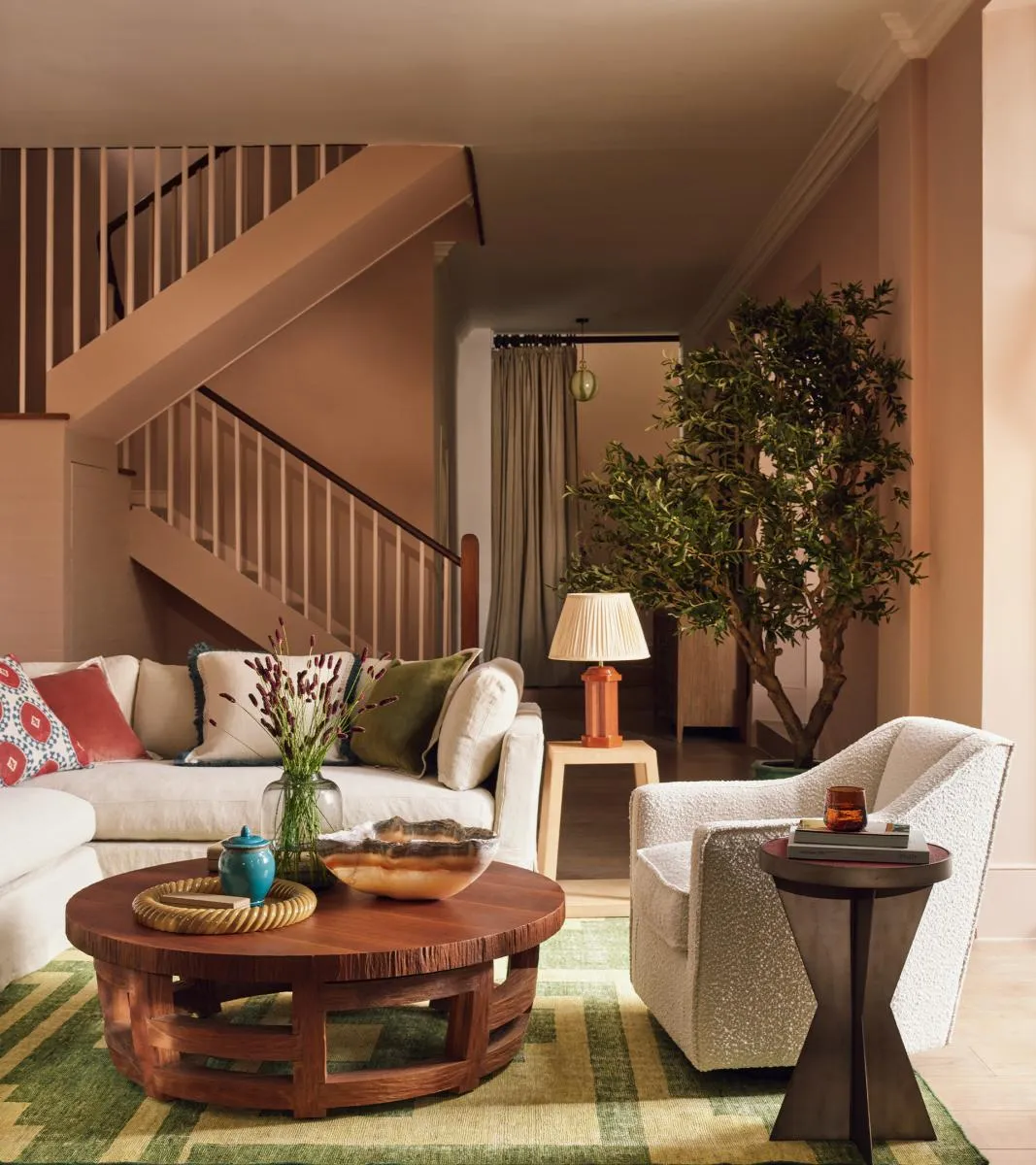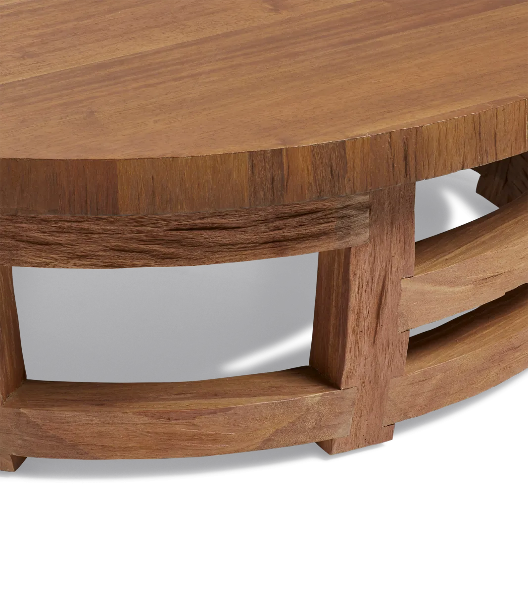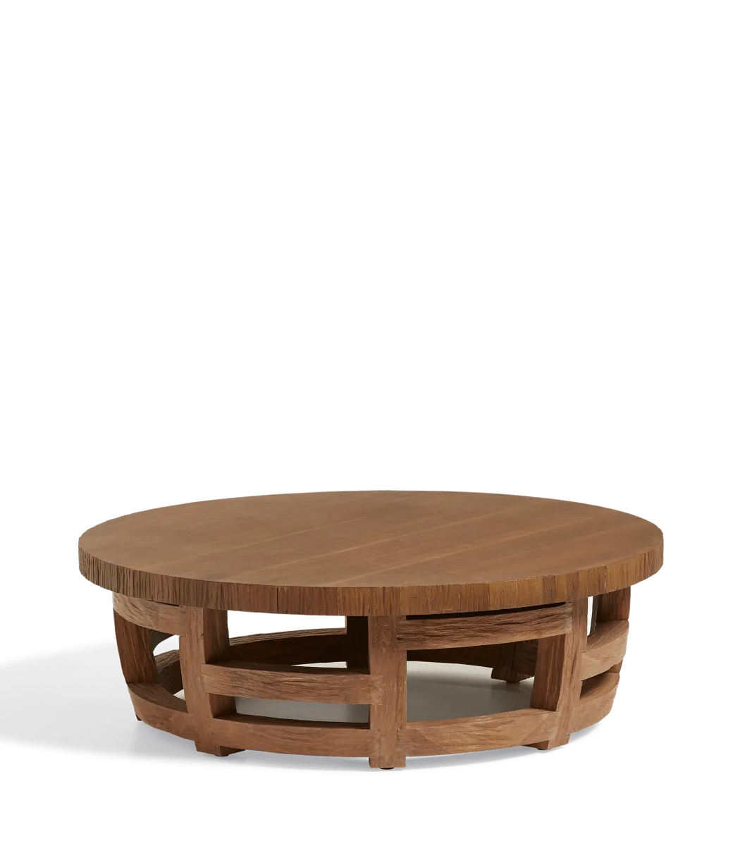 The Beatrix Coffee Table by OKA is a stunning blend of sustainability and style, crafted from reclaimed bangkirai wood, also known as yellow Balau. This highly durable hardwood is finished with a matt lacquer that enhances its rich tones and textures.
