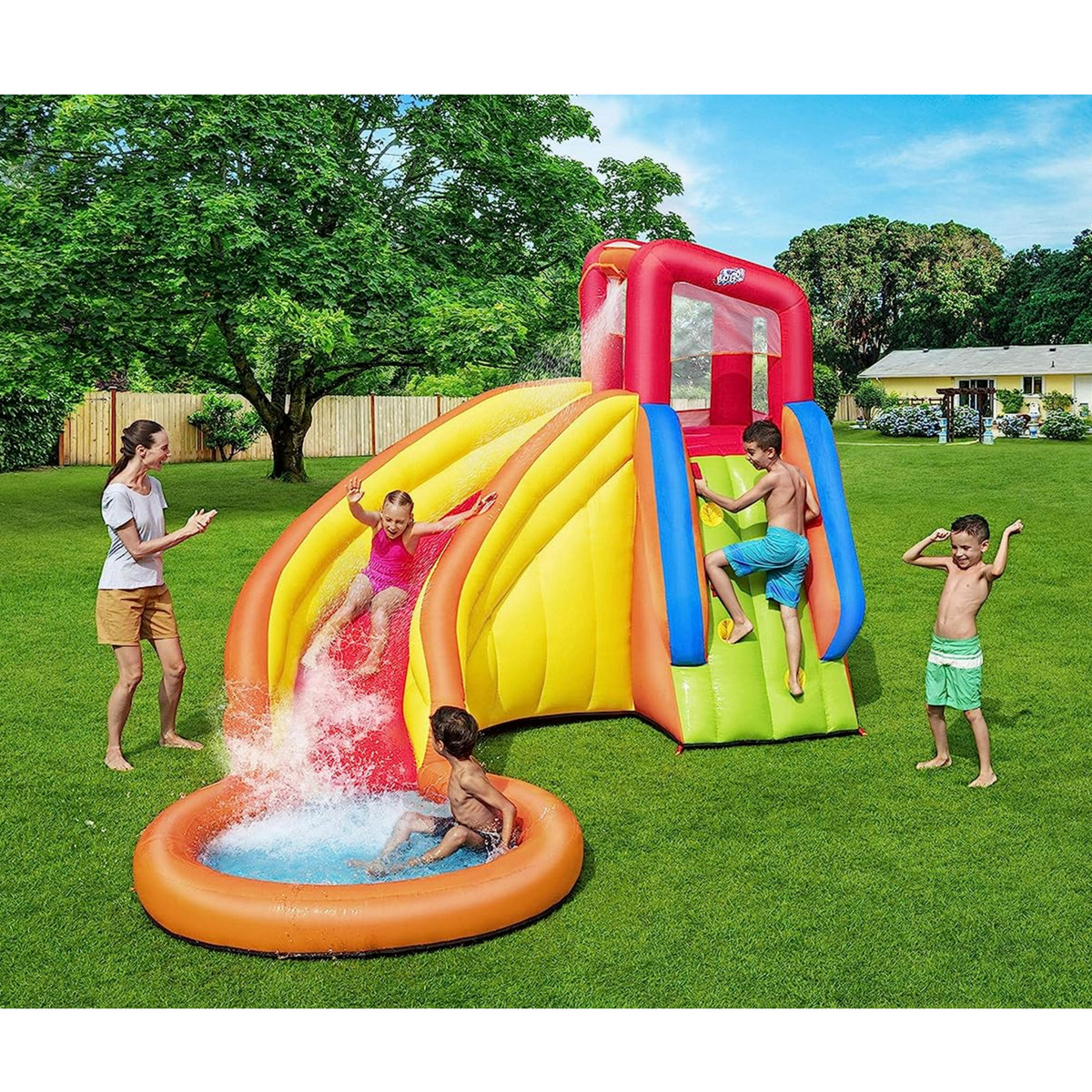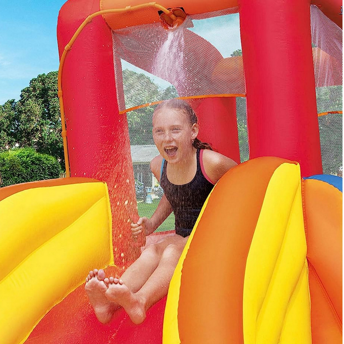- COMPLETE SET FOR SUMMER: includes 1 slide, 1 blower, 1 repair kit, 1 storage bag, 10 bouncer stakes, 1 anchor bag, a water spray hose attachment and 2-year warranty