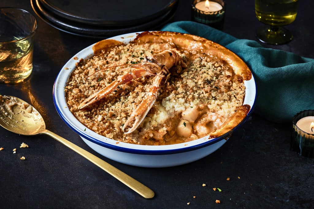 The pie is crowned with a creamy mash and a cheesy parsley crumb, topped off with a whole langoustine for that extra touch of elegance. Whether it’s a holiday feast or a special family dinner, this Shellfish Thermidor Pie promises to impress with its depth of flavor and stunning presentation.