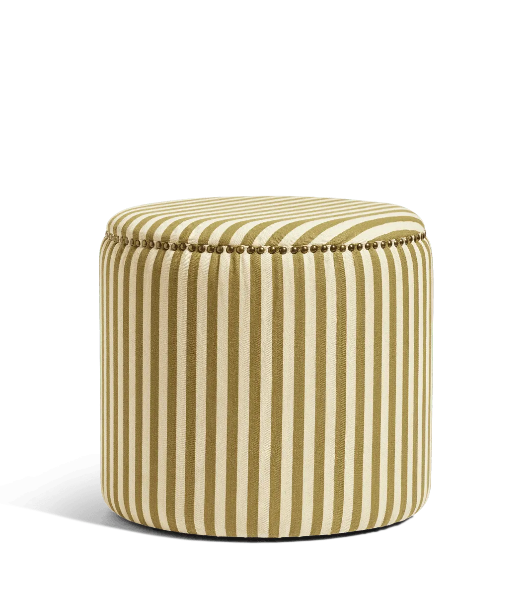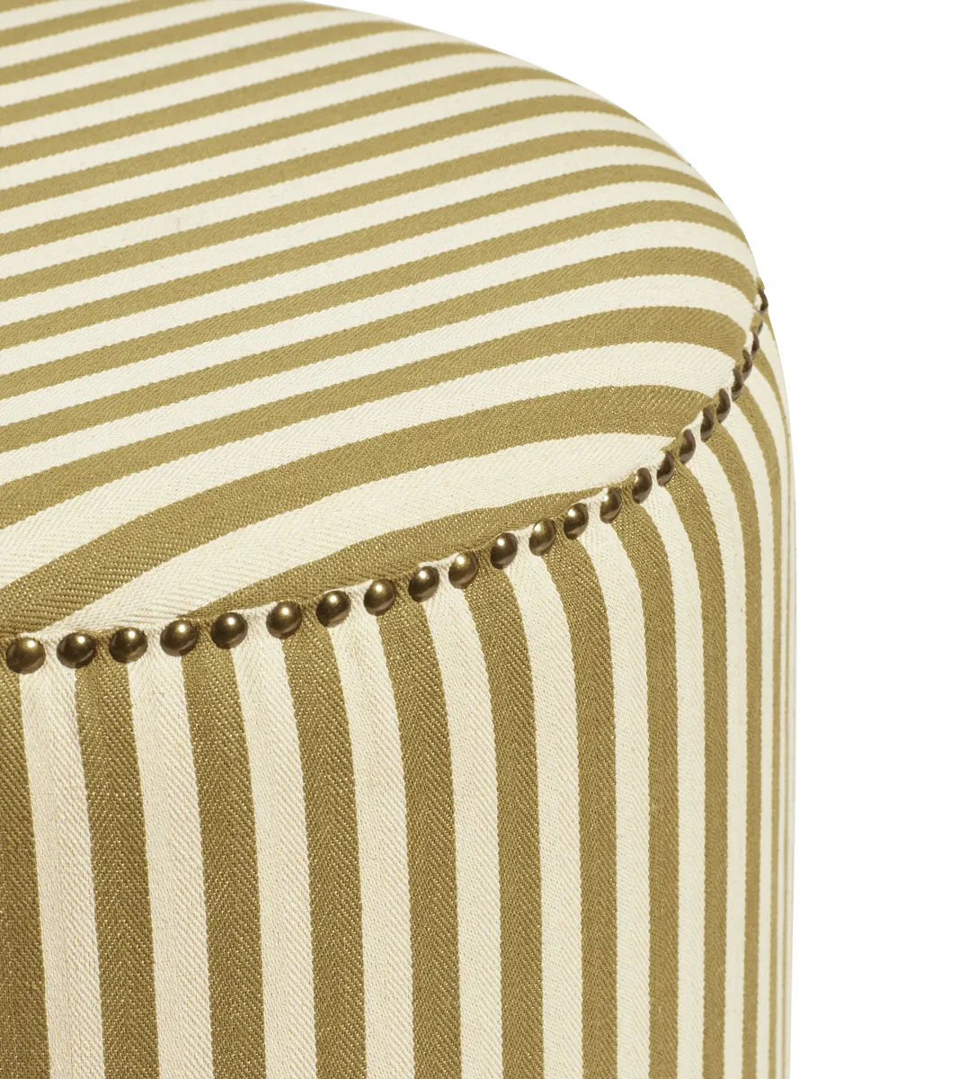 Enhance your home decor with the Costellini Linen Ottoman in Olive Stripe. This versatile ottoman features handwoven linen and antique brass-coloured stud details.