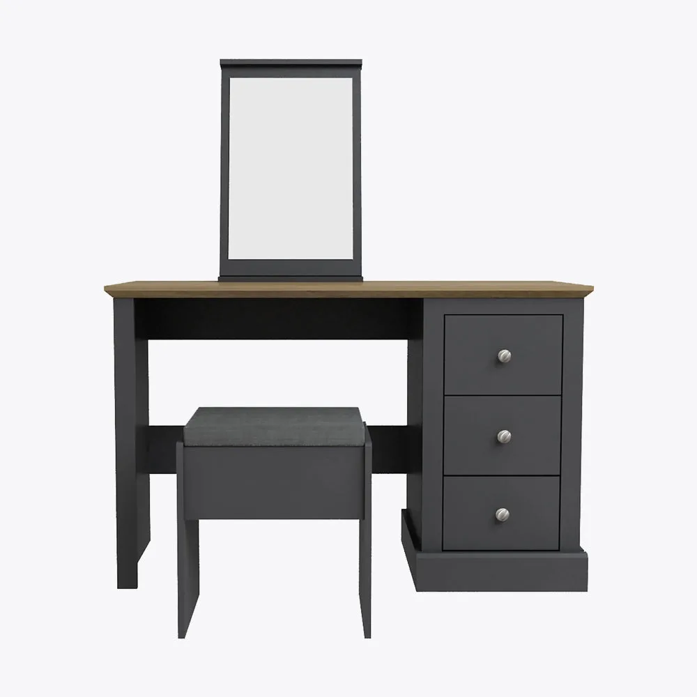 The charcoal grey finish contrasts beautifully with the oak effect details, creating a modern and elegant look. The set also includes a matching stool with a padded cushion for comfort. Whether you need a place to get ready in the morning, or a cosy spot to relax, the Devon dressing table set will suit your needs.