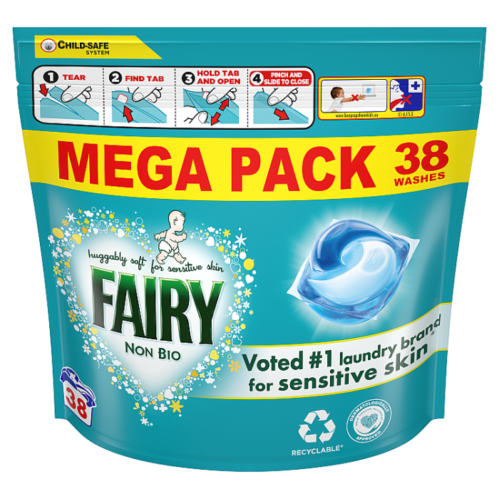 The unique multi-compartment design ensures a highly concentrated cleaning power, releasing different ingredients at the precise moment they’re needed during the wash cycle. Perfect for sensitive skin, Fairy Non Bio PODS® leave your laundry clean and soft, offering 38 washes of trusted Fairy efficiency.
