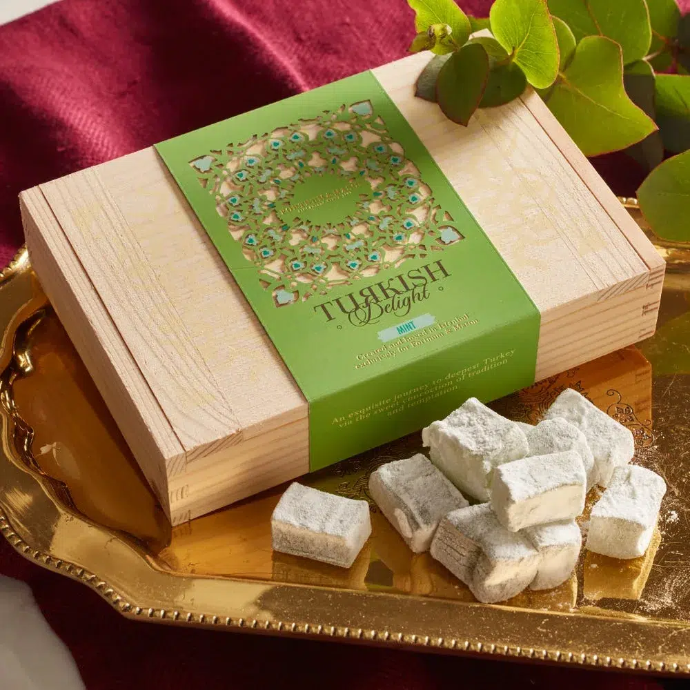 Seek no further for the perfect gift with the 227g box of stunning Mint Turkish Delight. This is a unique gift idea that comes in its own wooden box. These delightful Turkish Delights are a great gift idea and will be loved by all recipients.