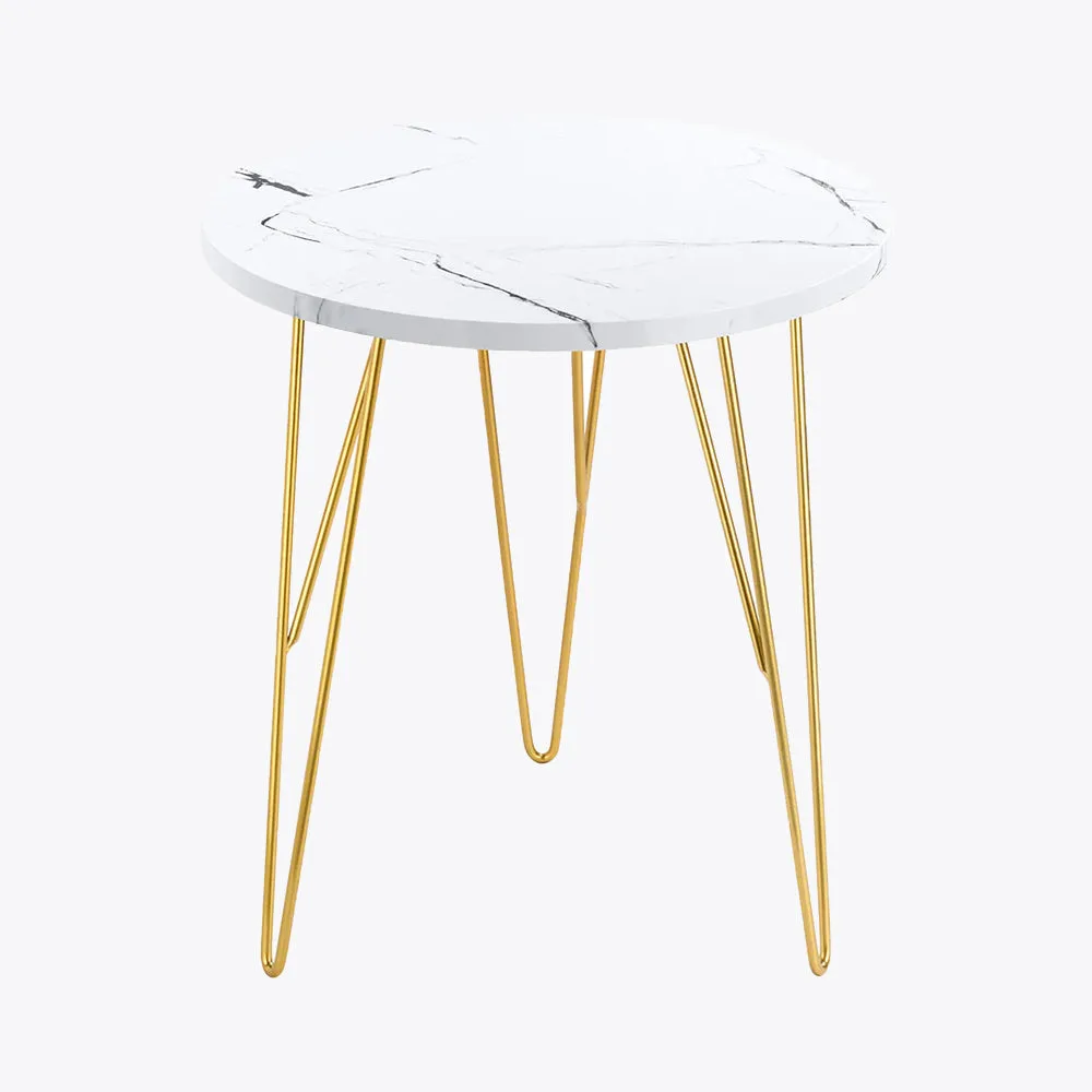 The Fusion Lamp Table White Marble with Gold Legs is a stylish and modern piece of furniture that will add a touch of elegance to your living room. The faux marble table top has a smooth and glossy surface that contrasts beautifully with the gold hairpin legs.