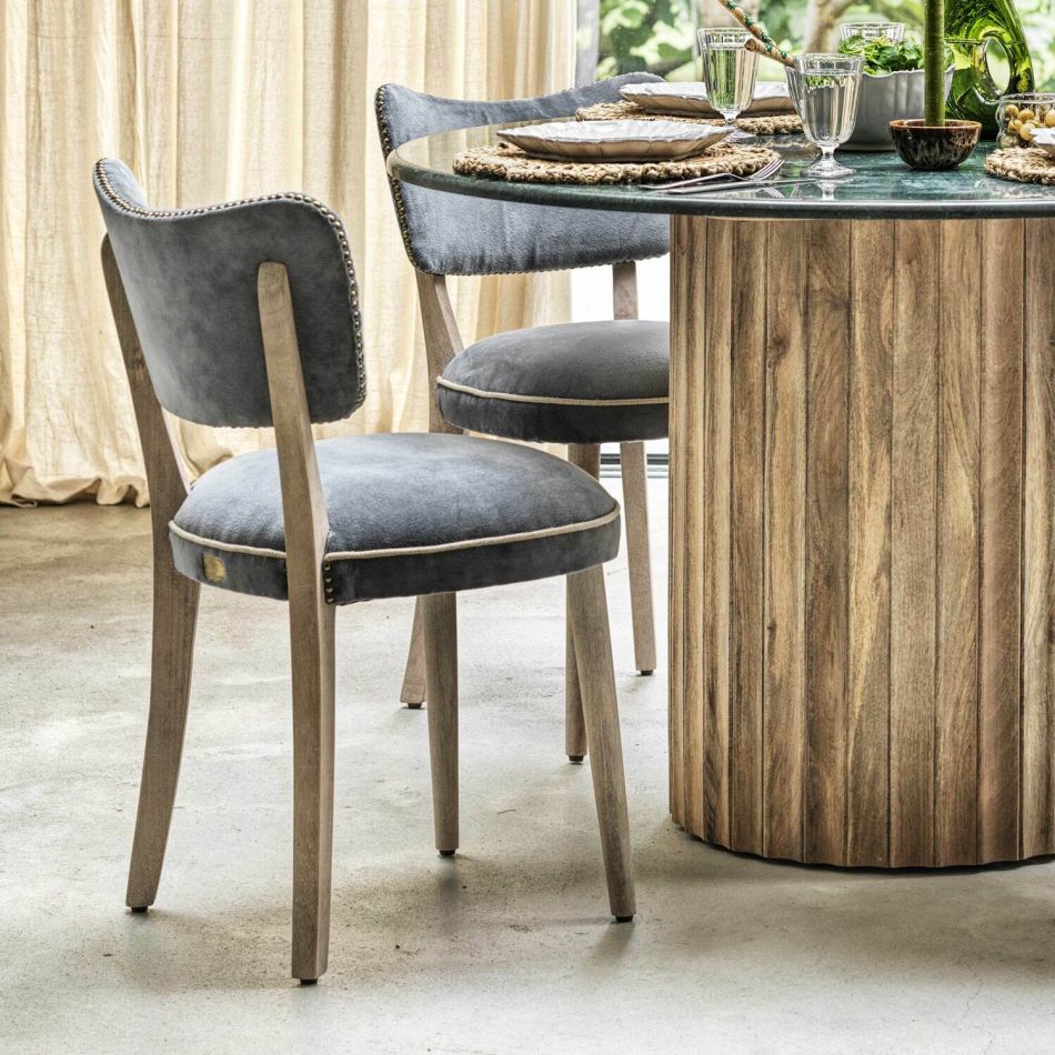 Elevate your dining experience with the exquisite Velvet Upholstered Dining Chair from Graham and Green. This chair, exclusive to Graham and Green, is a testament to fine craftsmanship, handcrafted from durable mango wood and enveloped in a luxurious velvet fabric that promises both comfort and style.