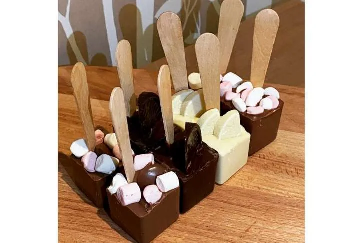 The Hot Chocolate Stirrers consist of a wooden stirrer nestled in a cube of rich chocolate that will melt in your hot milk as you stir.