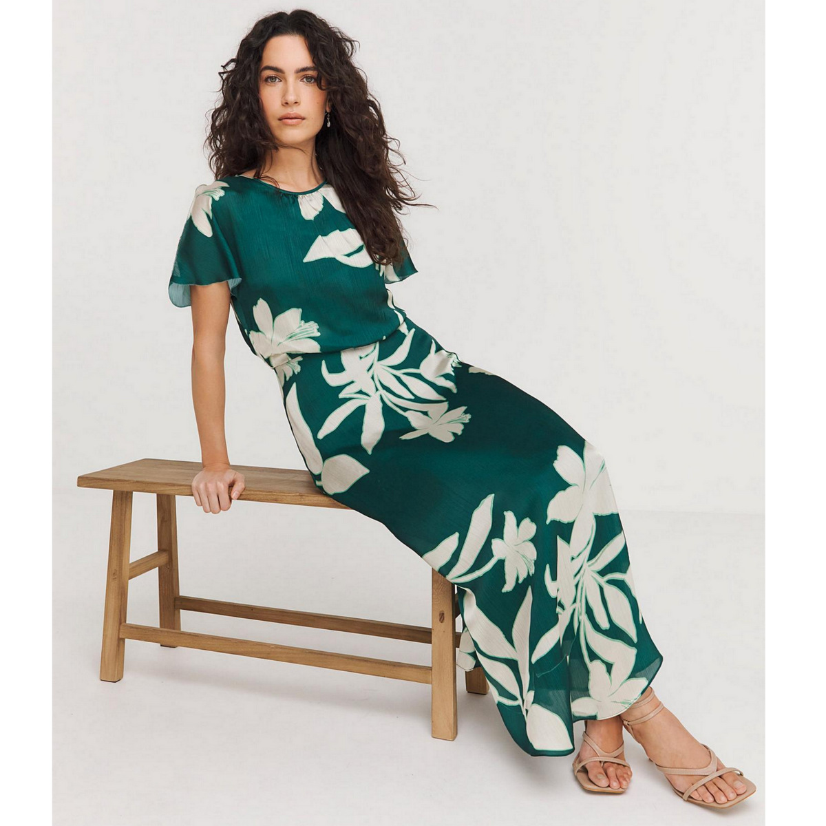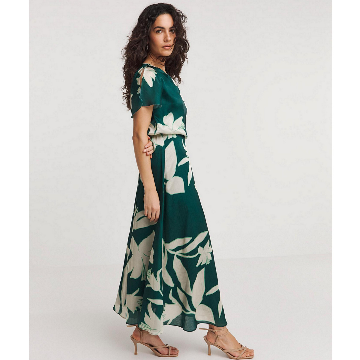 Step into the season with elegance in the Joanna Hope Floral Green Blouson Split Sleeve Dress. This exquisite piece is a symphony of design, featuring a delicate floral print that cascades over a luxurious textured chiffon.