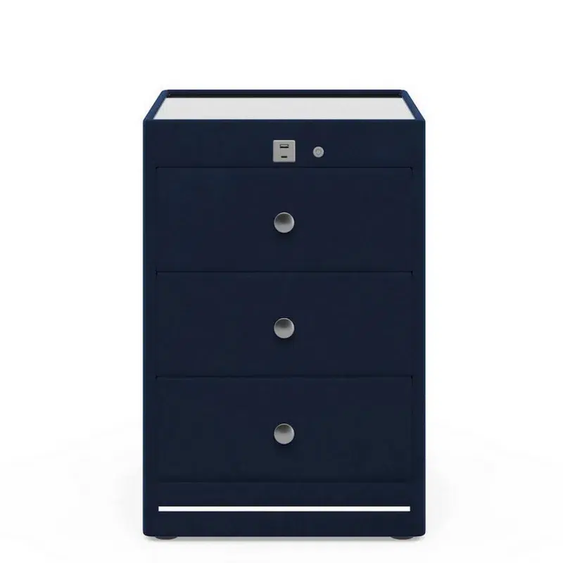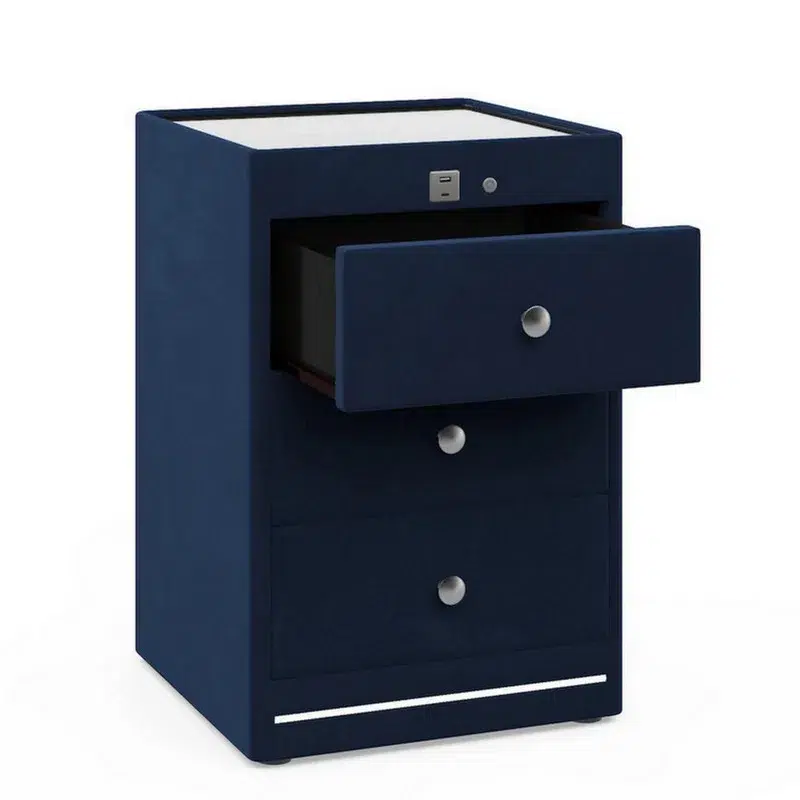 The Upholstered USB Bedside Table in Deep Blue is a useful table that has 3 drawers and dual USB charging points.