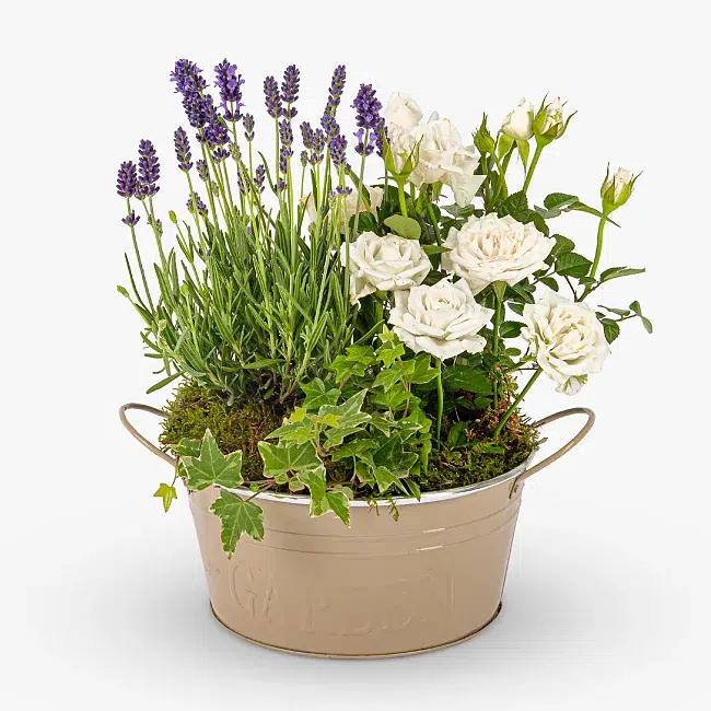Introducing our luxurious garden planter, crafted to bring a touch of elegance and sophistication to any outdoor space. This exquisite planter features a stunning combination of lavender, white roses, and hedera, expertly arranged to create a stunning visual display.