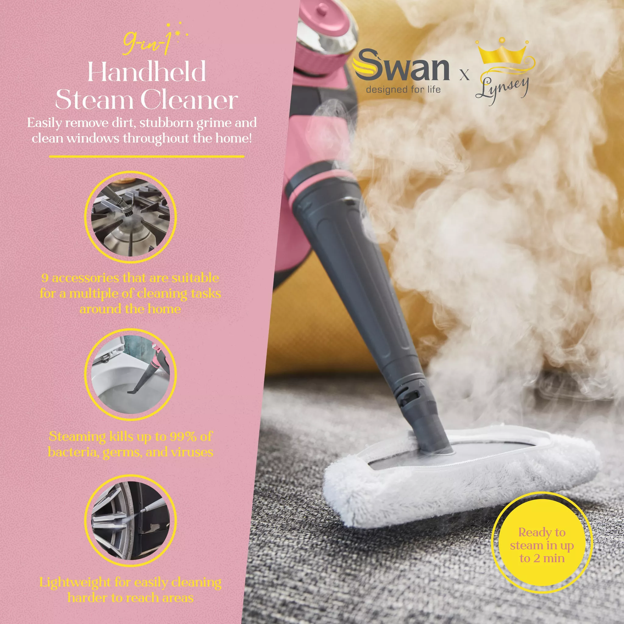 Transform your cleaning routine with Lynsey’s Cleaning Range Handheld Steam Cleaner, a versatile tool designed to effortlessly eliminate grime and sanitize surfaces.