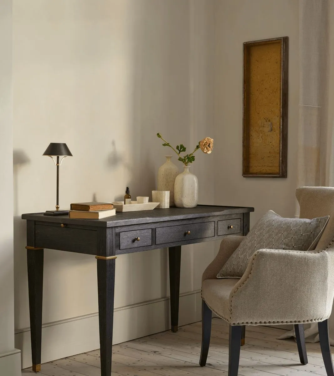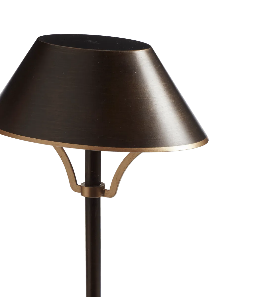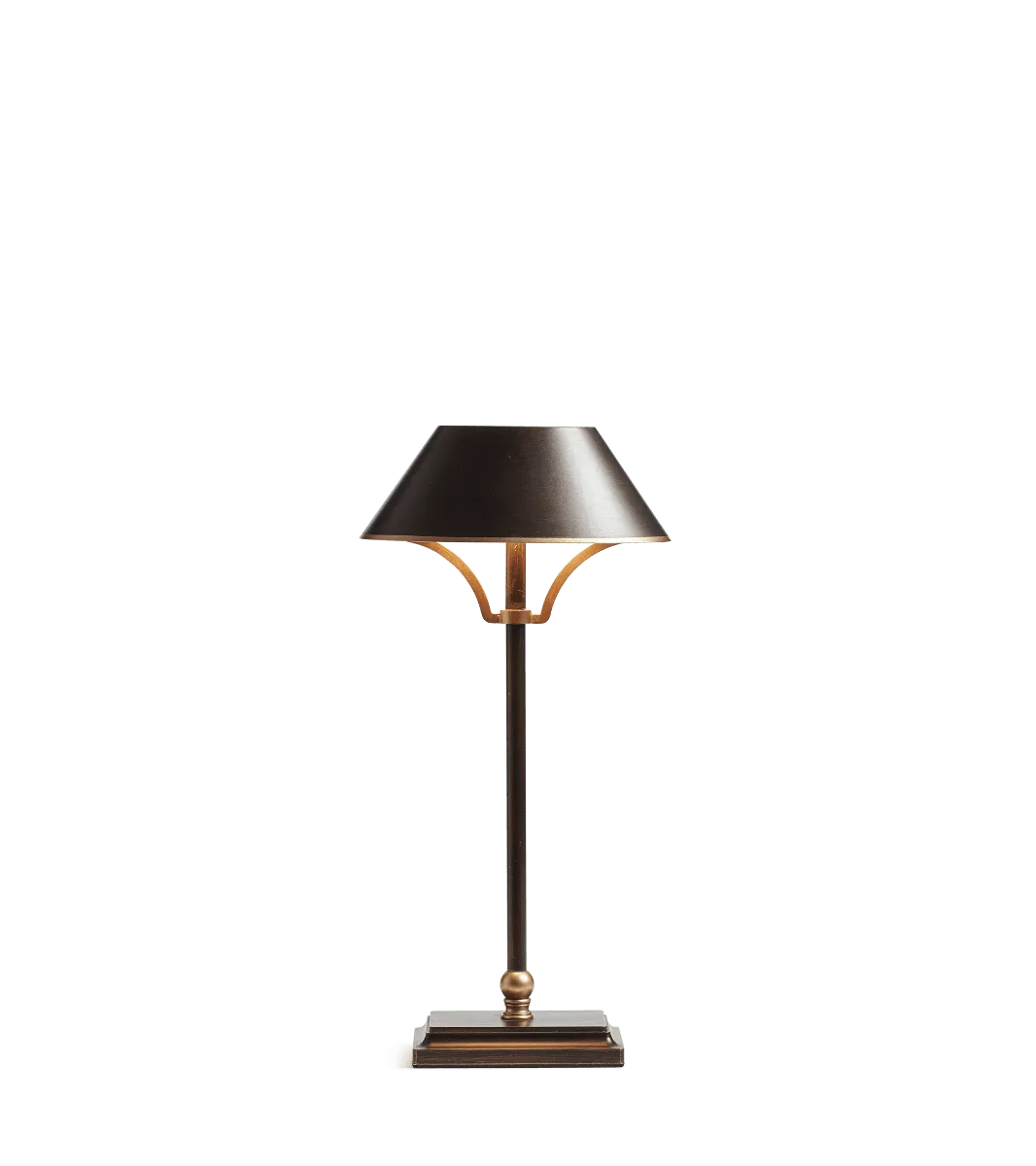 Indulge in the elegant design of the Mini Grisewood Wireless Lamp and Shade, available at OKA. This antique-style lamp is now more versatile than ever, featuring a petite size and cordless design. Handmade from brass and iron, its elegant stature makes it perfect for a desk in a home study or library, or as a small bedside lamp. Its wireless and splashproof nature also enables it to be used outside with no need for a socket.