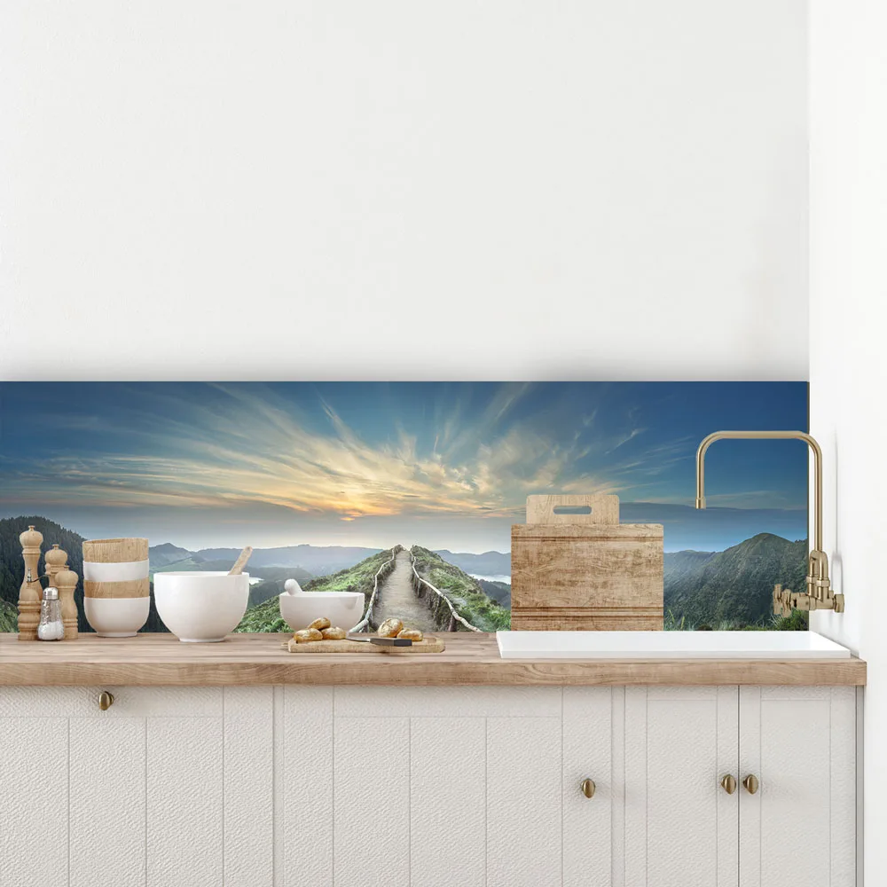 If you’re looking for a splash of colour in your kitchen or bathroom, look no further than the Mountain Landscape Custom Splashback that can be designed to meet your requirements.
