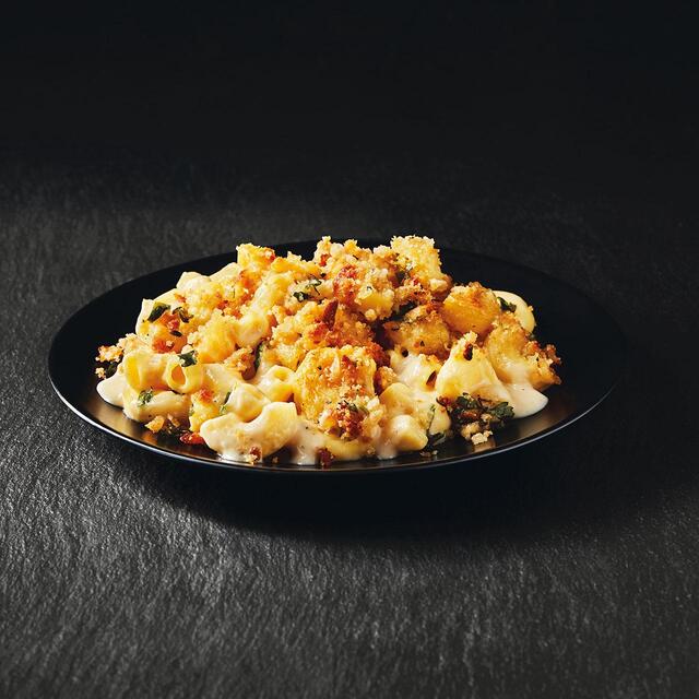 Enjoy the ultimate comfort food with M&S Our Best Ever Mac & Cheese for Two, featuring free-range egg pasta, a blend of cave-aged Cheddar, Pecorino, Emmental, and Mozzarella cheeses, and topped with roasted garlic oil breadcrumbs, crispy onions, and fresh parsley.
