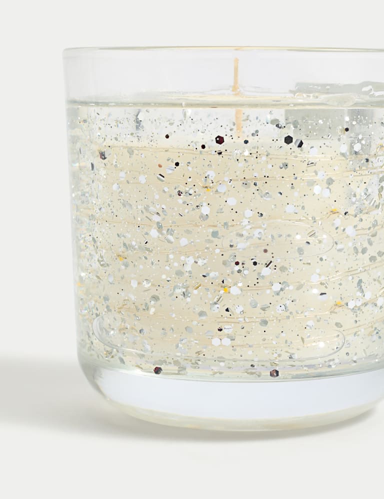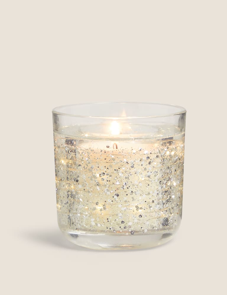 Encased in a sleek silver container, the candle features a unique LED light mechanism that, when lit, activates a warm, iridescent glow, enhanced by sparkling silver sequins embedded in the gel. This innovative design not only adds a touch of elegance to any room but also offers a soothing, multisensory experience. Perfect for gifting or personal indulgence, this candle promises to elevate the ambiance of your home.
