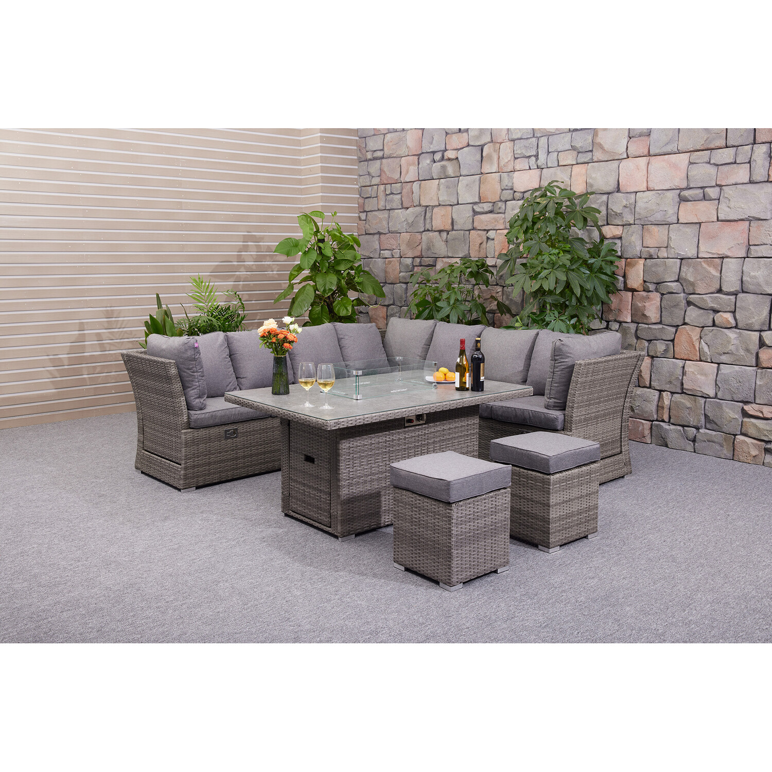 - Includes: 1 x Sofa Right, 1 x Sofa Left, 1 x Fire Pit Table, 2 x Stools, 1 x 6kg Glass Beads