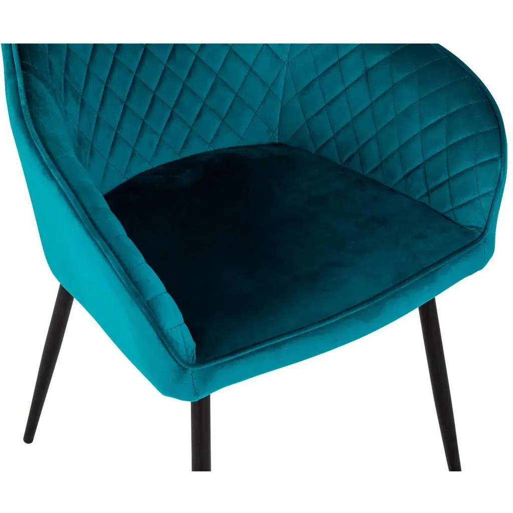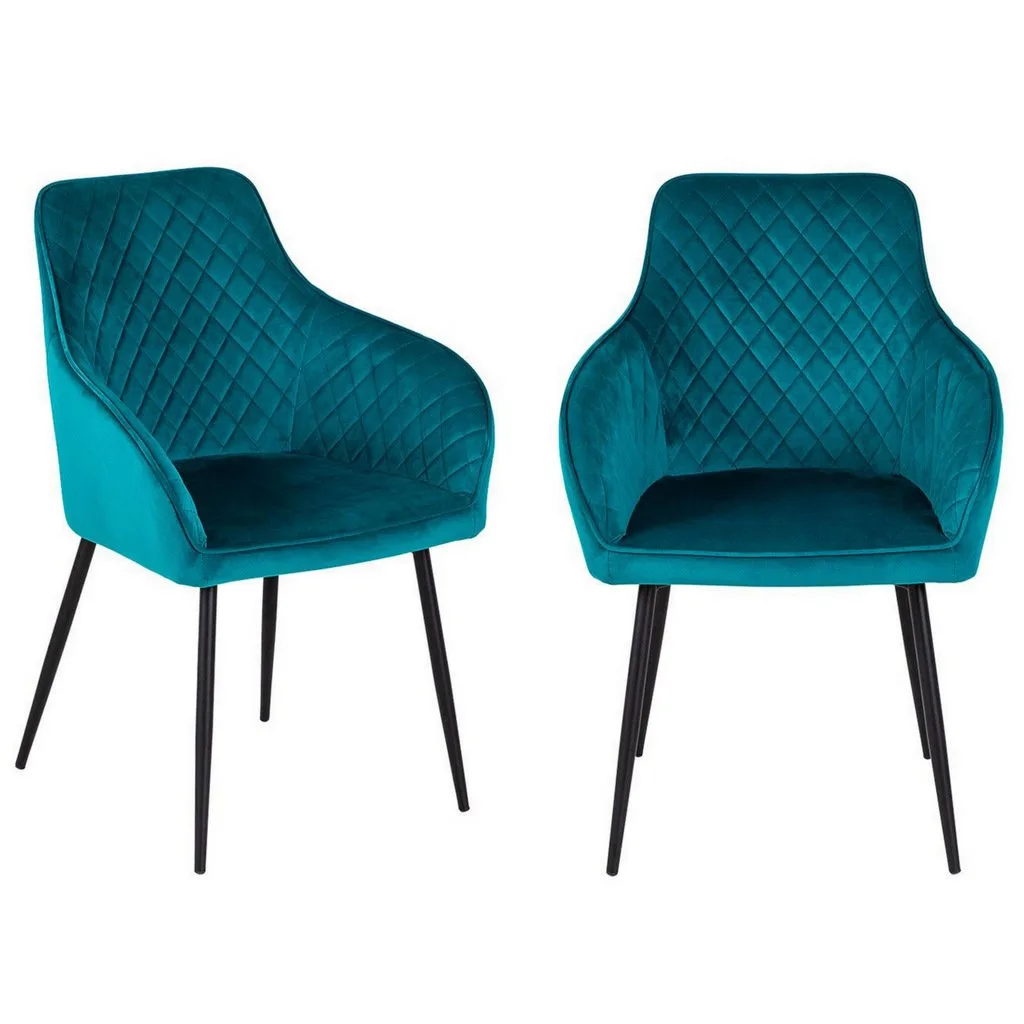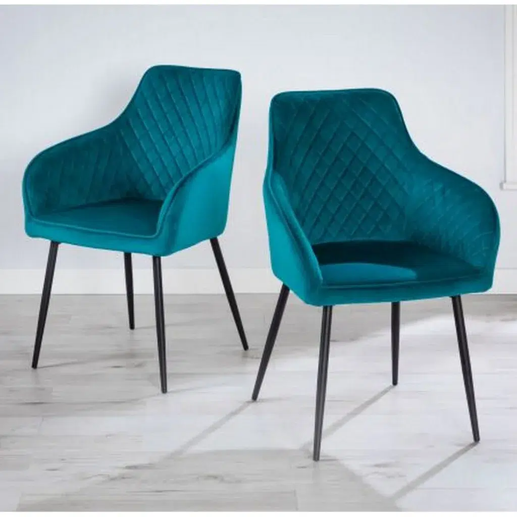 Relax and Dine in style with the pair of teal velvet Hampton dining chairs. These very comfy and cosy chairs with arm rests will give you and your guests the perfect sit for dining, playing board games or doing home work. The seat cover has a Teflon protection finish that helps to repel dropped food and drink.
