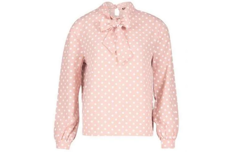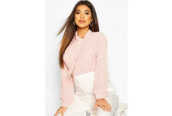 The Pastel Pink Polka Dot Blouse features a pussy bow and high neckline with long sleeves. The stylish Spring top will go with almost any bottoms and bring a fresh look ot your wardrobe.
