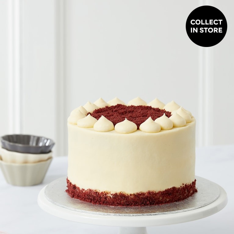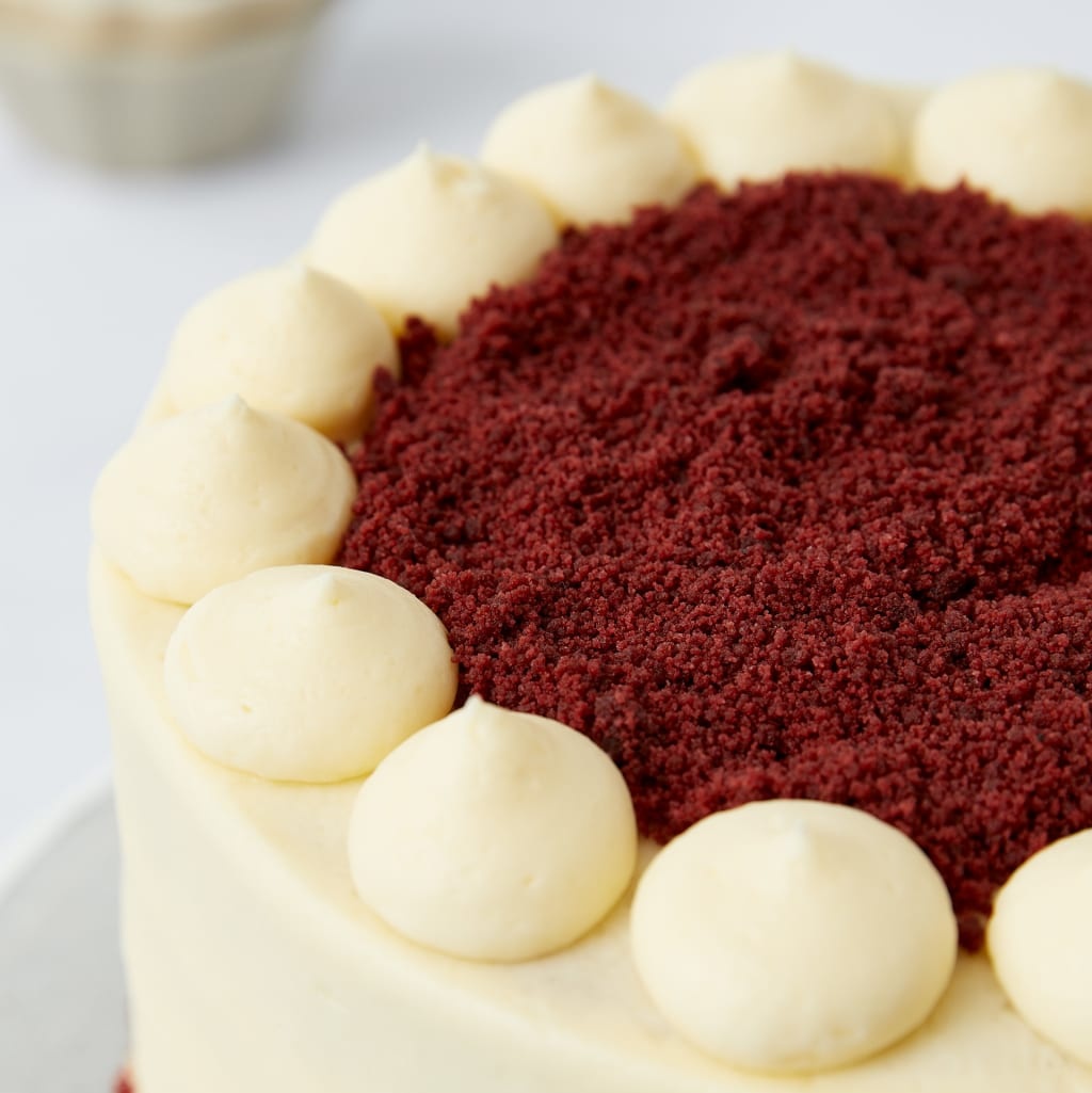 Red Velvet Cake (Serves 16) – Four layers of red velvet sponge with cream cheese frosting and red velvet crumbs.