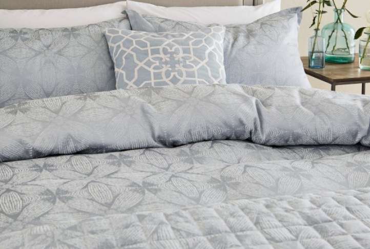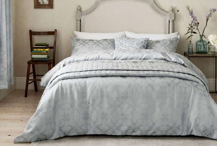 The Single Sanderson Sycamore duvet cover features an elegant jacquard weave in mist blue that brings an interpenetration of a Sycamore leaf.