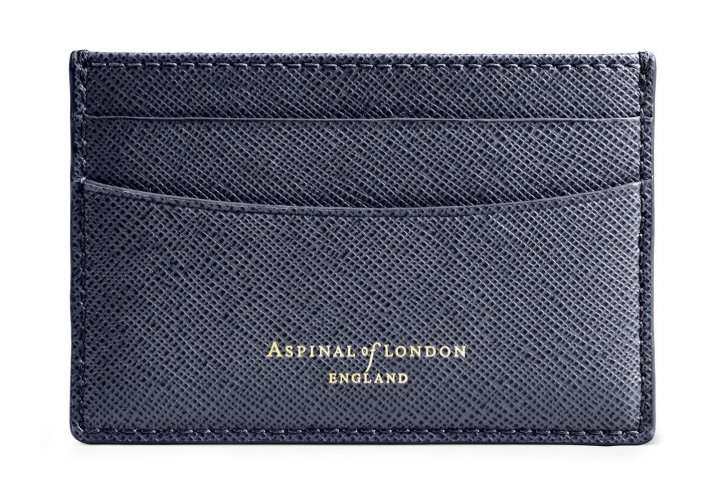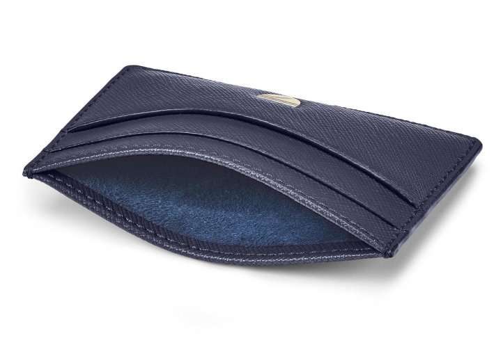 The Slimline Credit Card Holder in Navy Saffiano holds up to 6 credit cards or business cards with ease. The slimline design ensures that the holder does not create that uncomfortable back pocket bulge.