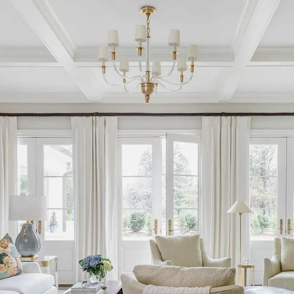 The Vivian chandelier ceiling light is a designer piece that combines antique brass, crystal and linen to create a stunning focal point in any room.