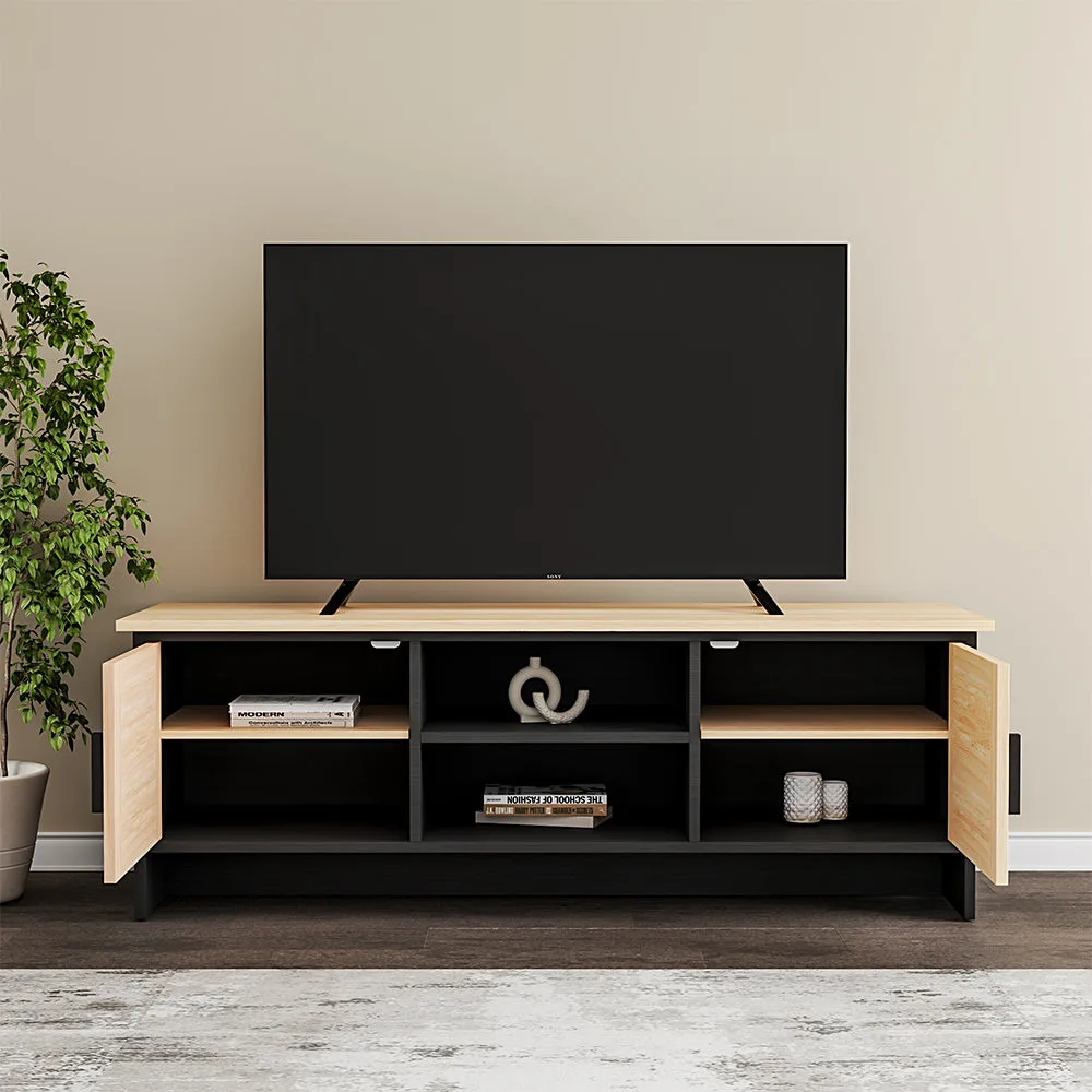 It has four spacious drawers with metal handles for storing your DVDs, remotes, magazines and other essentials. The open shelf can accommodate your media devices, such as a DVD player, a game console or a soundbar. The top surface can hold a TV up to 60 inches.